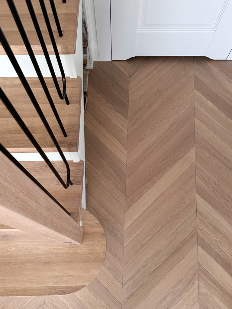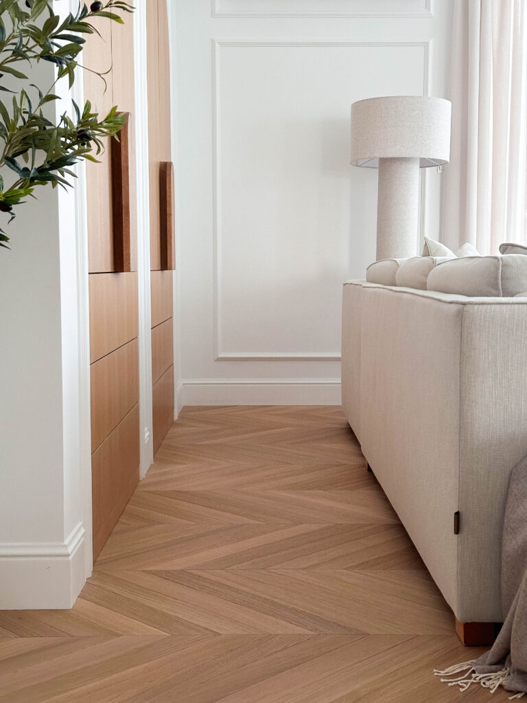 Podłoga w jodełkę wygląda przepięknie! Mimo że wymaga więcej pracy to na prezentuje się dużo ładniej 🙂
