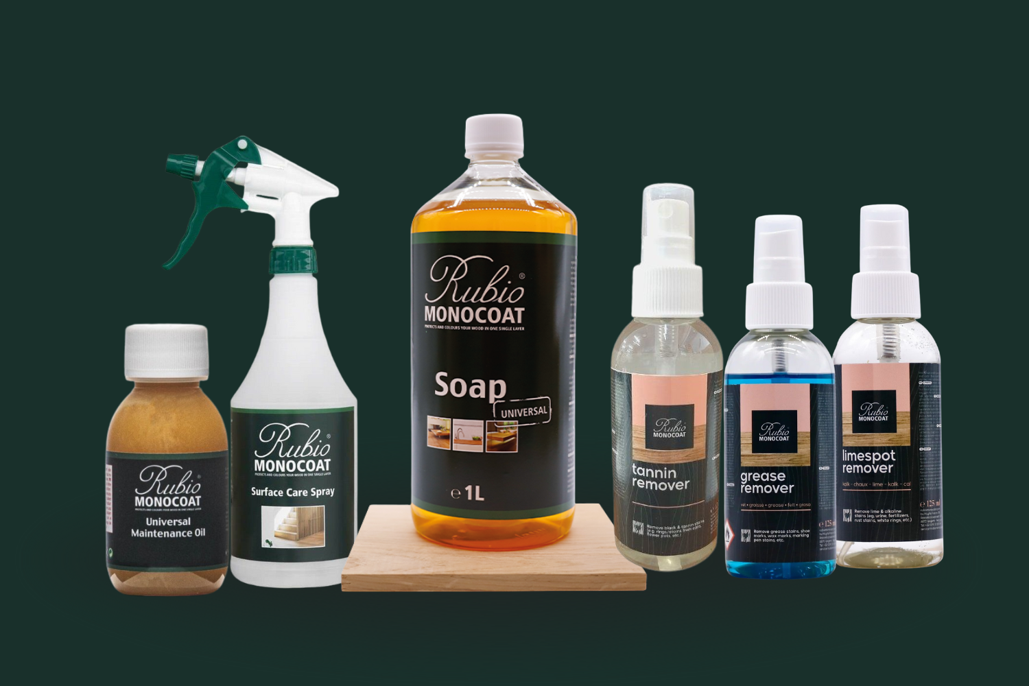 Mam też zawsze pod ręką trzy specjalistyczne preparaty do trudnych, specyficznych plam: Rubio Monocoat Tannin Remover idealny na plamy powstałe w wyniku reakcji drewna na kwas lub wodę, Rubio Monocoat Limespot Remover na plamy z wapienne lub zasadowe np. plamy po winie oraz Rubio Monocoat Grease Remover na tłuste zabrudzenia. Dzięki nim każdą problematyczną plamę mogę usunąć szybko i skutecznie, bez ryzyka uszkodzenia powierzchni.